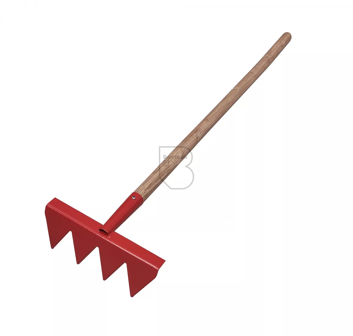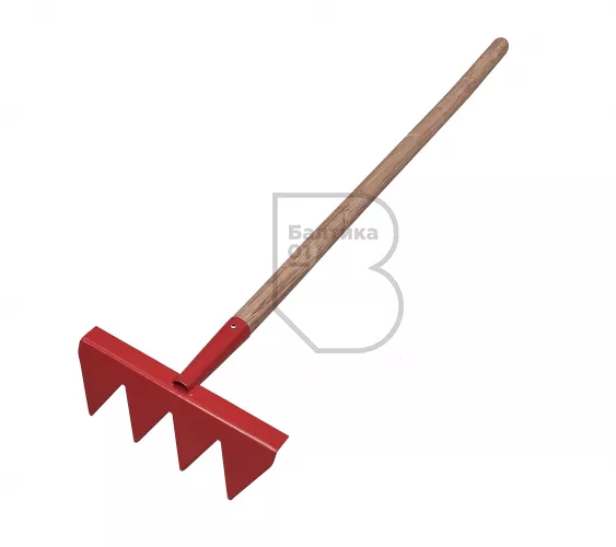 Грабли выполнены из металла, имеют четыре зуба и деревянный черенок.