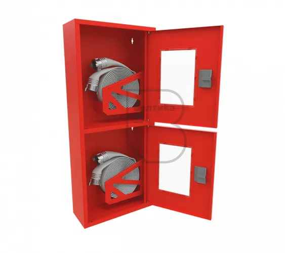 Дверца пожарного шкафа открывается на 160 градусов, открывание двери универсальное (правое и левое). Дверца имеет дополнительные загибы для усиления жесткости конструкции. На двери и корпусе шкафа предусмотрены отверстия для опломбирования шкафа. Дверь пожарного шкафа имеет запорное устройство в виде пластиковой защелки. Дверь закреплена с помощью монтажного штифта, при необходимости она может быть снята в результате простого нажатия на кнопку штифта. На каждой дверце имеется смотровое окно со вставкой из стекла.